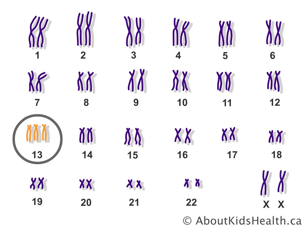 Trisomy 21 – when there are 3 homologous arms of chromosome 21. This is a visible condition where a patient develops a flat face, small ears, a short neck, almond shaped eyes and small hands and feet. It may cause developmental delays, intellectual disability and an increased risk for certain medical issues.